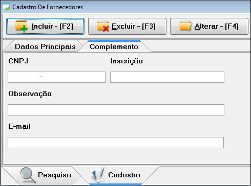 Clicando na aba "Complemento", pode-se adicionar outros detalhes sobre os fornecedores como: CNPJ, Inscrição, Observação e também E-mail.
