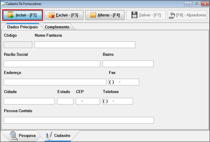 Assim sendo, basta clicar na aba "Cadastro", depois no botão "Incluir"[F2], preencher os campos e clicar em "Salvar"[F7].