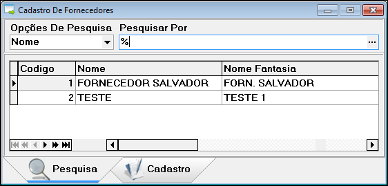 Como nas outras telas, abre primeiro a tela de pesquisa dos fornecedores cadastrados.