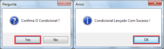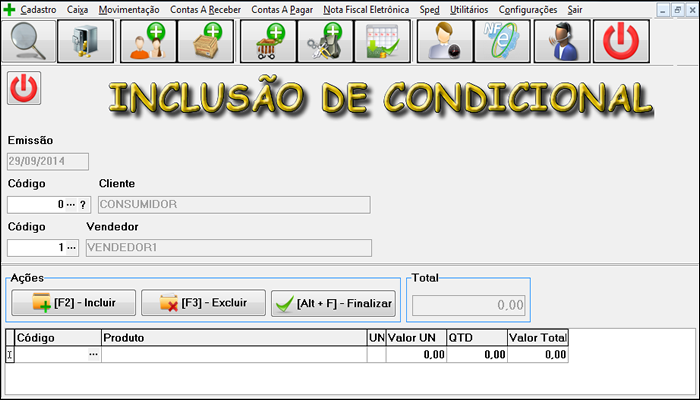 Após incluir os produtos da condicional finalize a inclusão, clique em "Finalizar", [Alt + F] no teclado, e confirme a saída da condicional.