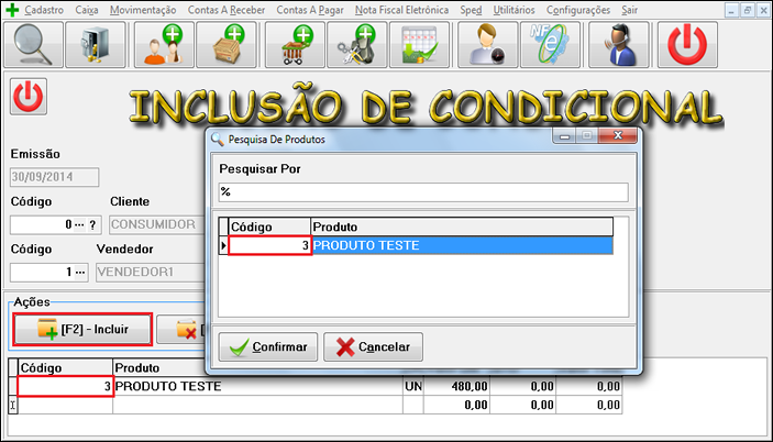 Na tela de "Inclusão de Condicional", deve-se preencher os códigos: "Cliente" e "Vendedor", após isso é só incluir os produtos que vão para a condicional, clicando em "Incluir", [F2] no teclado, digite o código do produto, ou pesquise-o apertando [F6] no teclado, ou clique nos [...] "três pontinhos".