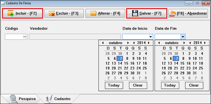 Ao entrar na tela de "Cadastro de Férias", clique em "Incluir", [F2] no teclado, pesquise ou digite o código do funcionário, selecione as datas, período das férias, e clique em "Salvar", [F7] no teclado.