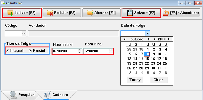 Ao entrar na tela de "Cadastro de Folgas", clique em "Incluir", [F2] no teclado, pesquise ou digite o código do funcionário, selecione a data da folga, se for uma folga parcial clique em "Parcial" e informe a "Hora Inicial" e a "Hora final", caso contrario selecione "Integral", que conta o dia todo, e clique em "Salvar", [F7] no teclado.