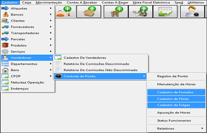 Depois de ter cadastrado a carga horária de cada funcionário na hora do cadastro de vendedor, pode-se fazer uma manutenção de ponto, cadastrar feriados, ferias, folgas, acompanhar status de cada vendedor etc...