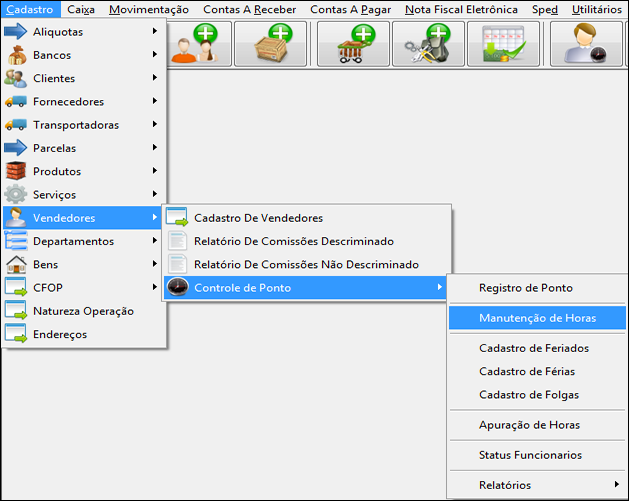 Para fazer a manutenção dos pontos dos vendedores, clique na aba "Cadastro", selecione "Vendedores", selecione “Controle de Ponto” logo após clique em "Manutenção de Horas", a imagem abaixo mostra o procedimento: