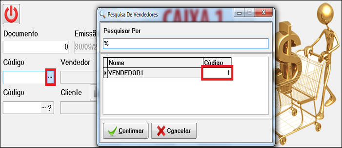 De dois cliques no vendedor ou cliente desejado e será preenchido os campos com código e nome.