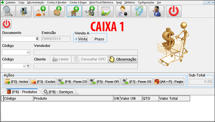 Quando aparecer as ordens de serviço dê dois cliques em cima do desejado, e confirme "Yes", depois os produtos e os serviços serão puxados para a tela de venda, clique em "Pagto", [Alt + P] no teclado. A seguinte tela é relacionada a forma de pagamento, preencha os campos corretamente, se foi em dinheiro, Cheque, cartão... ou se foi à prazo selecione a aba "A Prazo" e preencha os campos.