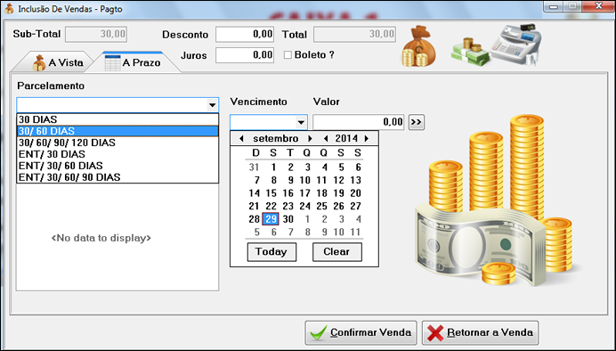 A imagem ao lado mostra a tela de pagamento à prazo, com o total a ser pago, em quantos dias serão parcelados e a data de vencimento.