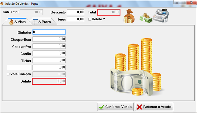 A imagem ao lado mostra a tela de pagamento a vista, com o total a ser pago, e "Débito", o troco se caso for pago em dinheiro.