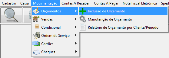 Para fazer a inclisão de Orçamentos, clique na aba "Movimentação", selecione "Orçamentos", logo após clique em "Inclusão de Orçamentos", a imagem abaixo mostra o procedimento: