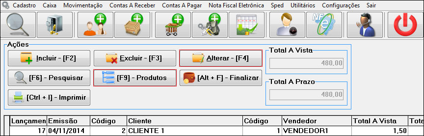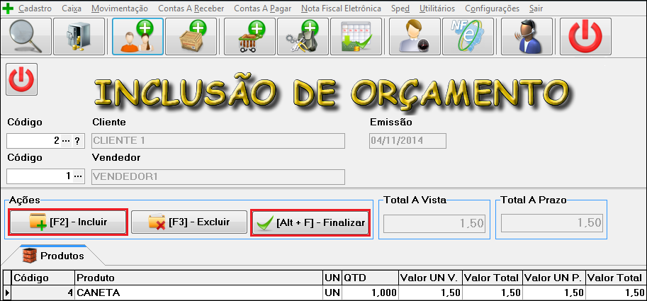 Preencha os campos do Cliente e do Vendedor, clique em "Incluir [F2]", adicone os produtos e clique em "Finalizar [Alt + F]".
